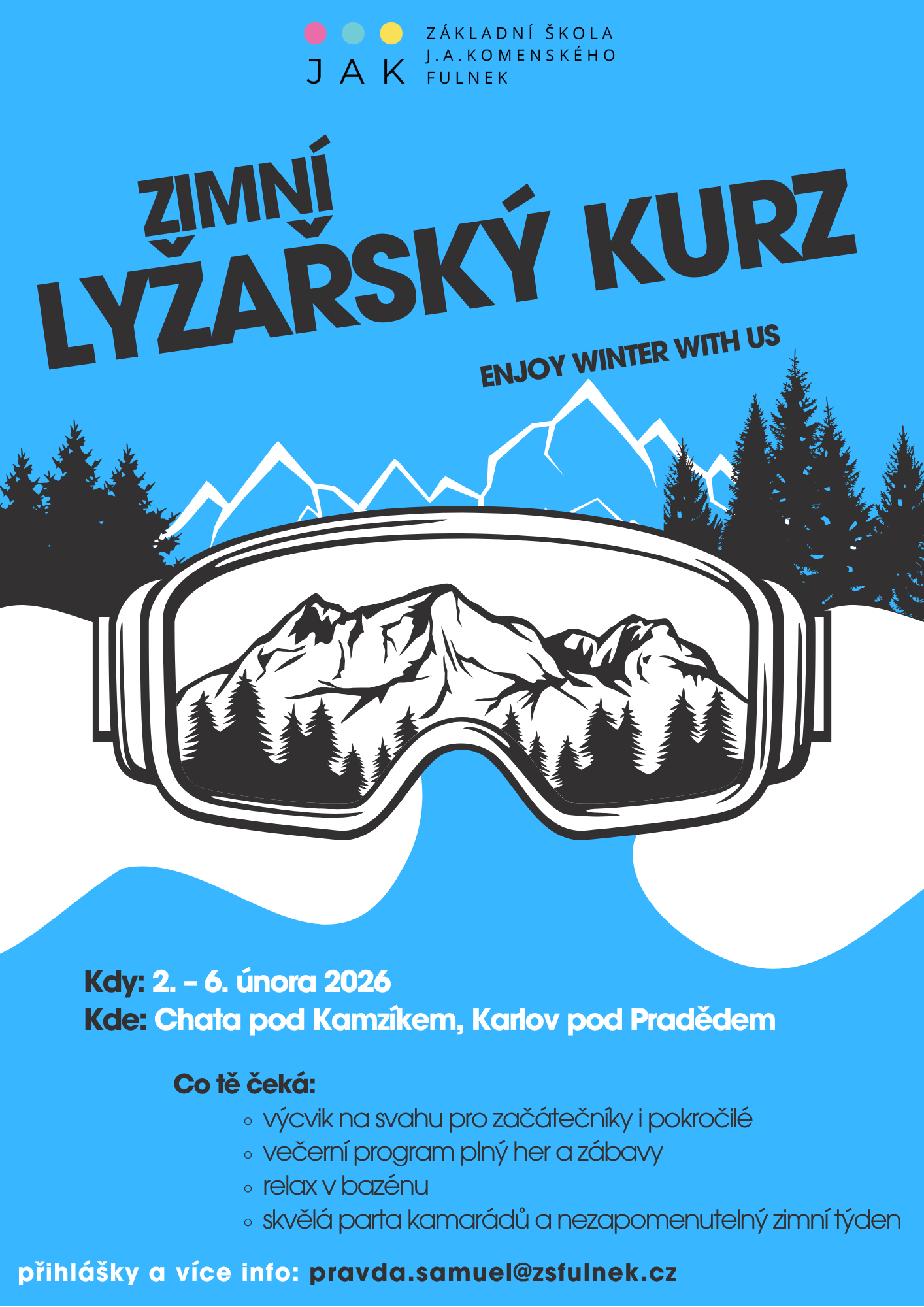 | Lyžařský kurz pro 2. stupeň | 2. – 6. 2. 2026 | plakát zde |