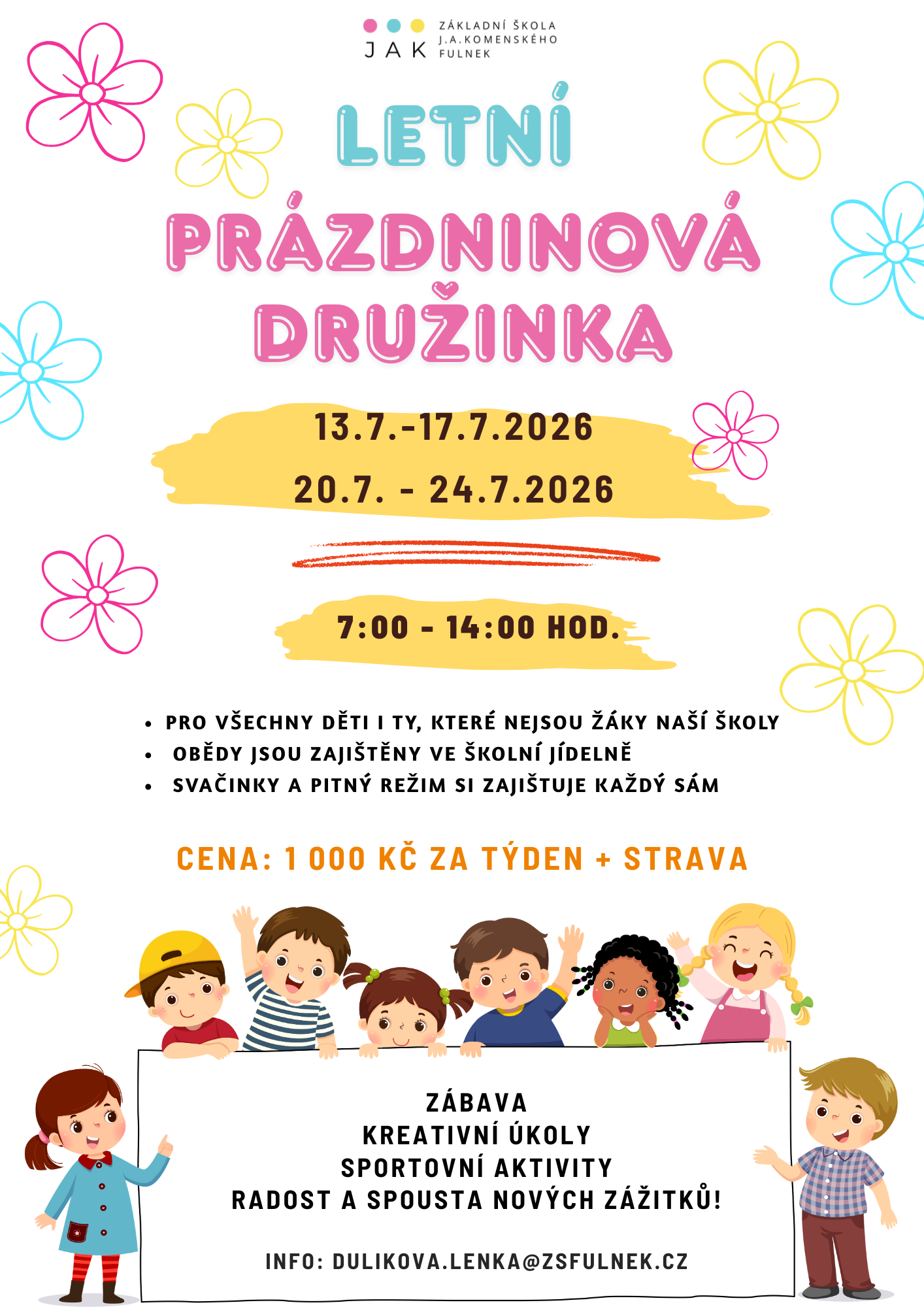 | Letní prázdninová družina | 1.-3. 7. 2026, 13.- 17. 7. 2026, 20.-24. 7. 2026 | plakát zde |