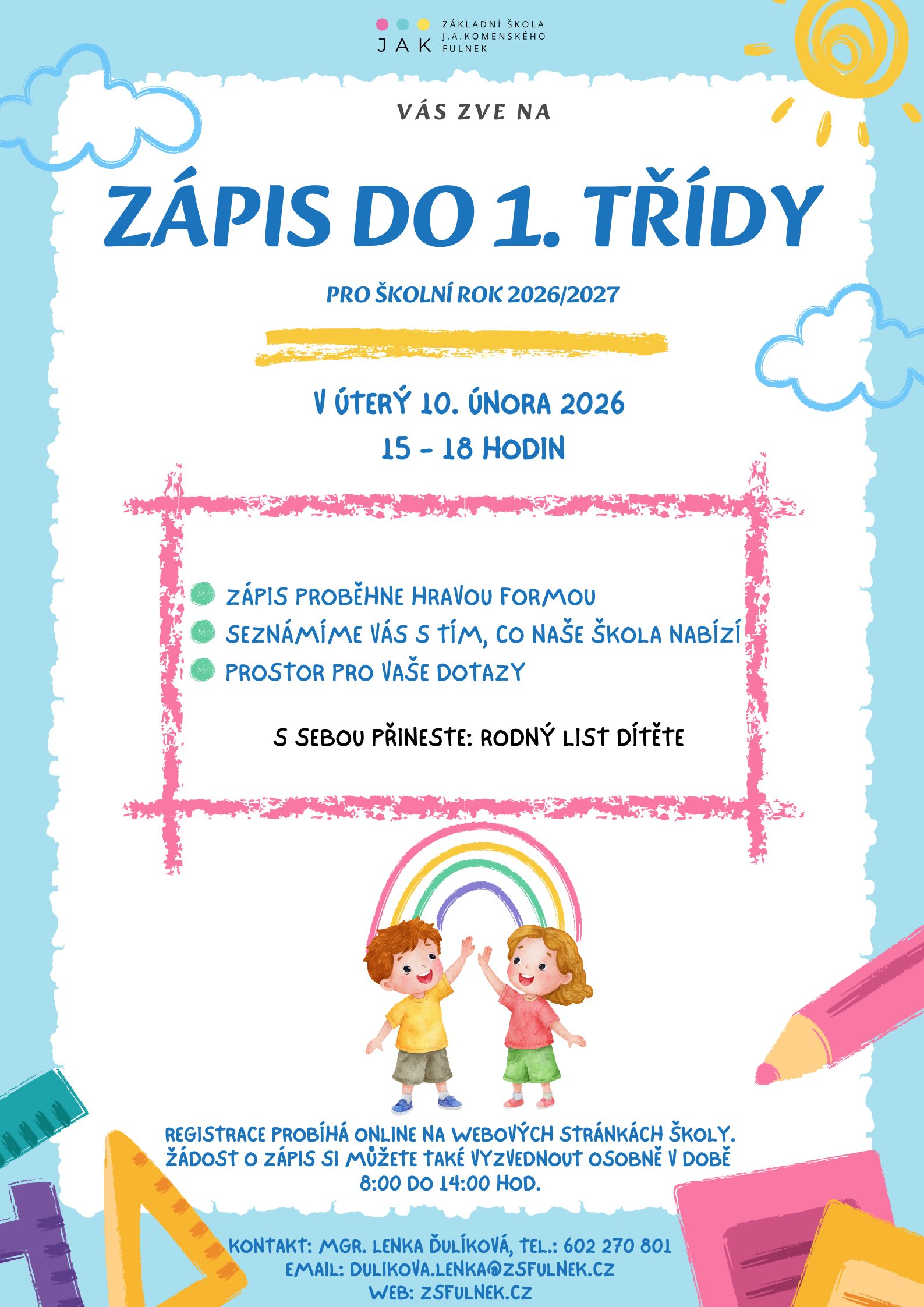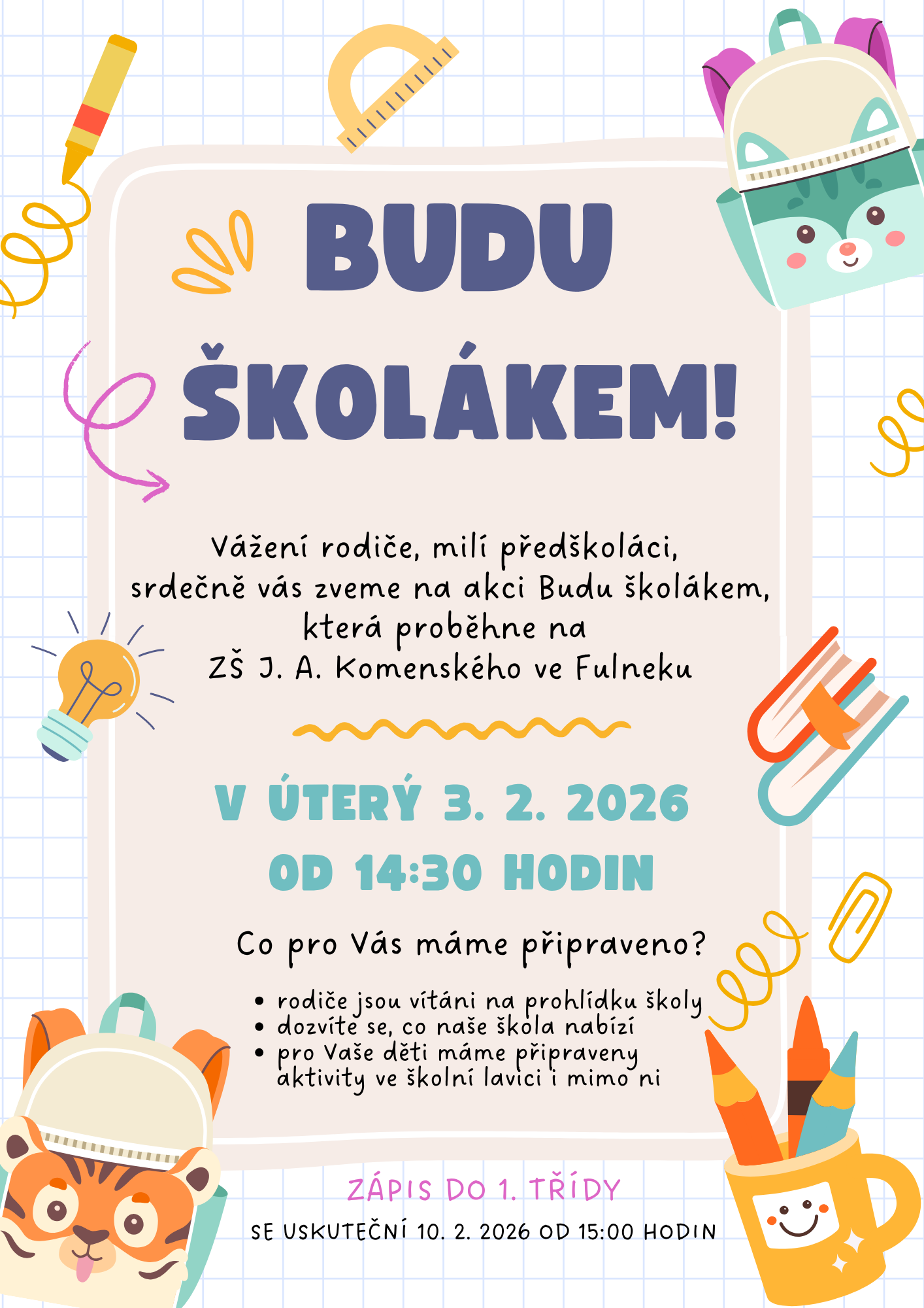 | Zápis do 1. třídy | 10. 2. 2026 v 15 hod. | plakát zde |